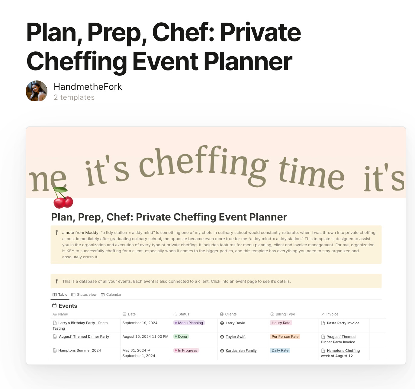 I never walk into a trial without a written prep list and timeline. And lucky for you I designed my own private chef planning template on notion (this is legitimately what I use myself) to stay organized. It will prompt you on everything to think through and it’s free!!!